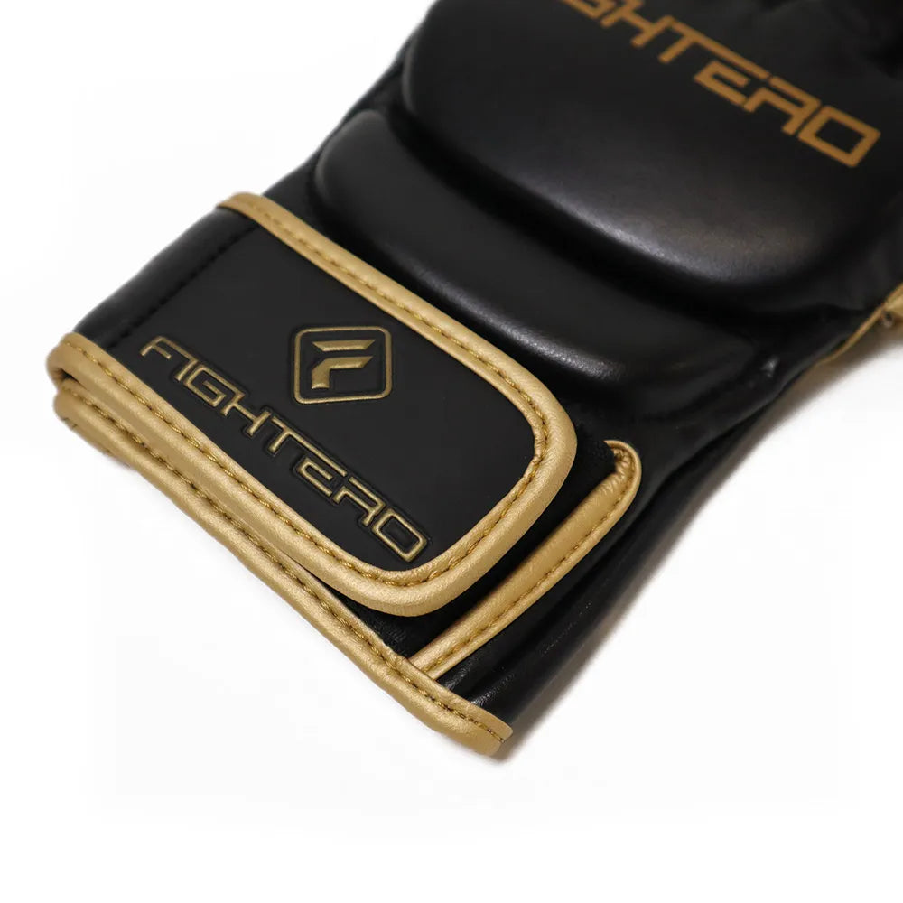 MMA-Handschuhe aus hochwertigem schwarzen Kunstleder mit goldenen Details, mit Doppelklettverschluss